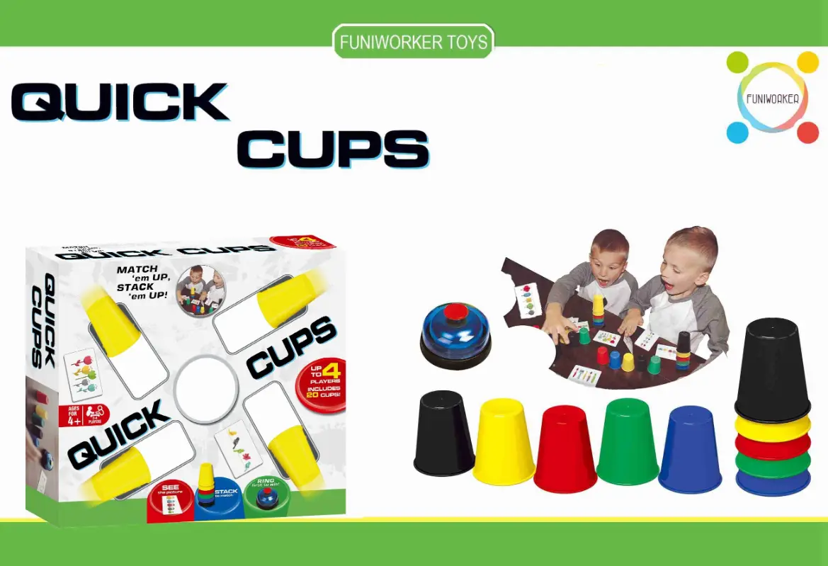 Quick Cups is a fast-paced, fun stacking game where players race to stack colored cups in the correct order based on cards drawn. It enhances speed, coordination, and visual perception, perfect for family game nights.