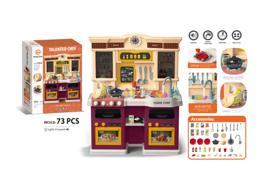The Talented Chef 73Pc Kitchen Set Toys includes realistic cooking utensils, pots, pans, and food items, perfect for imaginative play. Ideal for aspiring chefs, this comprehensive set encourages creativity and enhances fine motor skills.