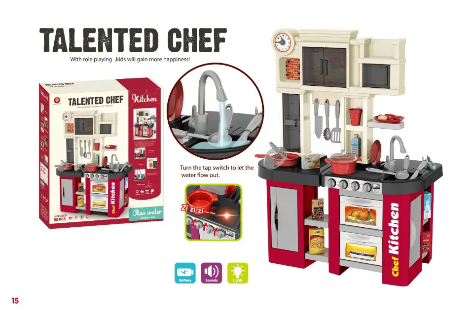 The Talented Chef 58PC Kitchen Set includes realistic cookware, utensils, and play food. Designed to inspire creativity and role-playing, it enhances motor skills, social interaction, and offers hours of fun for children interested in cooking.